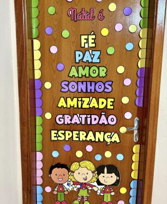 O painel apresenta uma árvore de Natal formada pelas palavras FÉ, PAZ, AMOR, SONHOS, AMIZADE, GRATIDÃO e ESPERANÇA, trazendo uma mensagem cheia de significado e espírito natalino. Uma decoração perfeita para criar memórias inesquecíveis neste Natal!