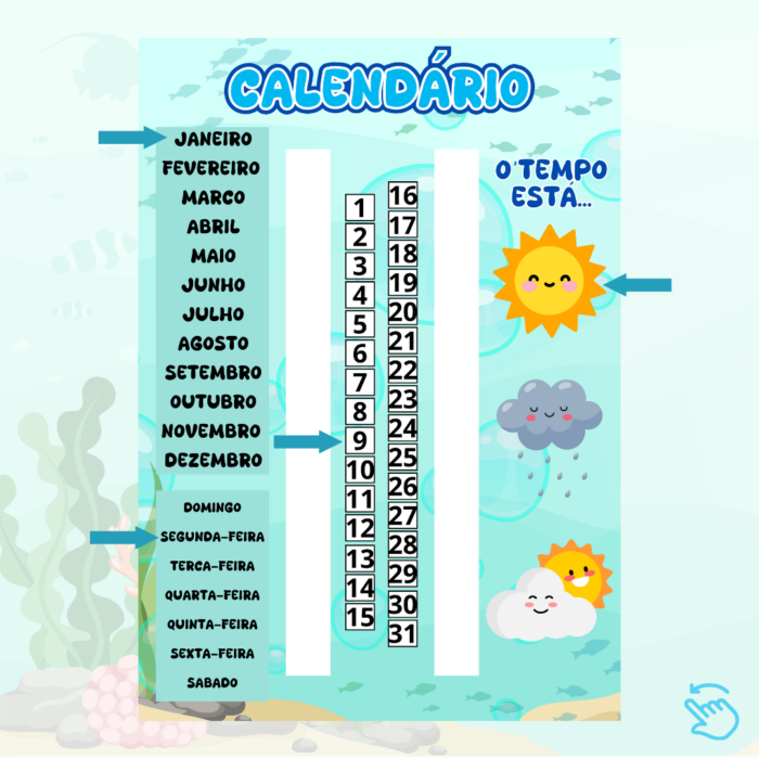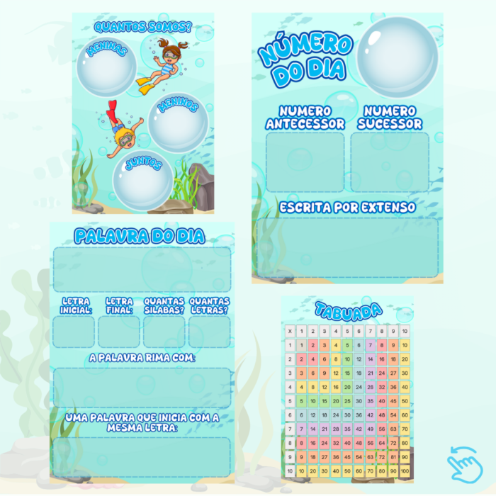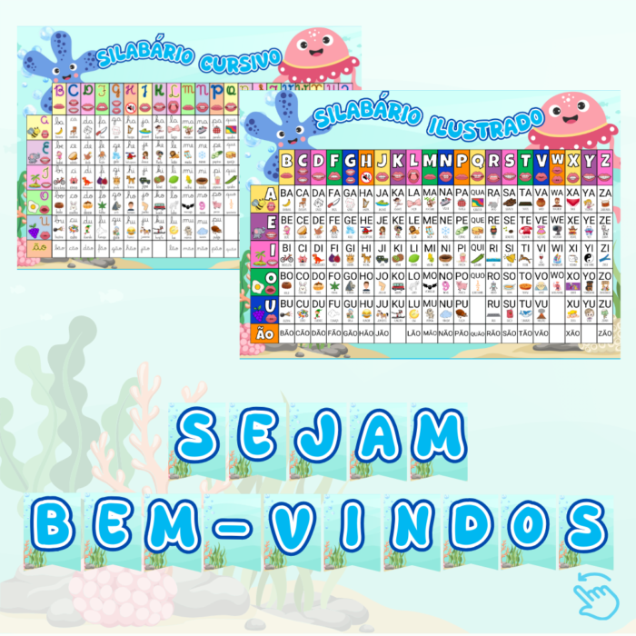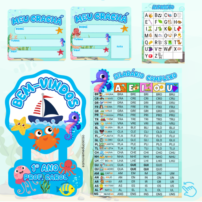 Alfabeto normal 4 formas, Alfabeto sílabas, Alfabeto caixa alta, Bandeirolas bem-vindo, Calendário com prendedor, Cartaz de aniversário, Cartazes formas geométricas, Chamadinha, Alfabeto Complexo, Cores, Crachá de mesa, Crachá de pescoço, Marcador, Meses do ano, Moldura primeiro dia de aula, Mural de avisos, Número do dia, Números 1 a 10, Palavra do dia, Palavras mágicas, Placa de porta, Quantos somos, Recadinho primeiro dia de aula, Semanário, Silabário simples, Tabela alfabética, Tabela de números 0 a 99, Tempo do dia.