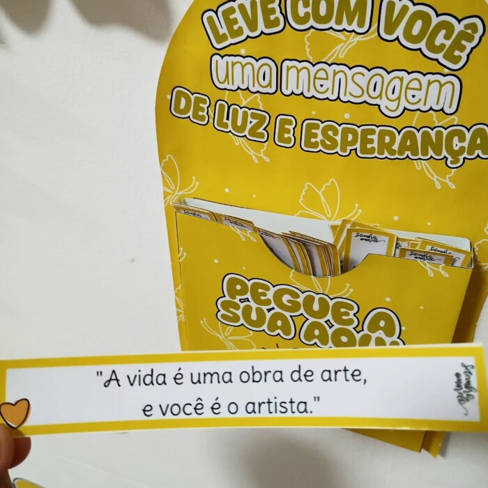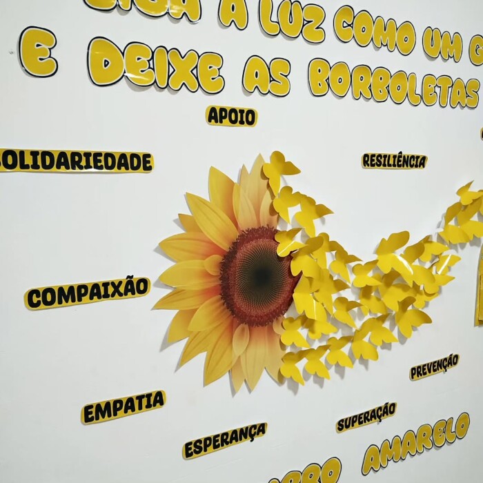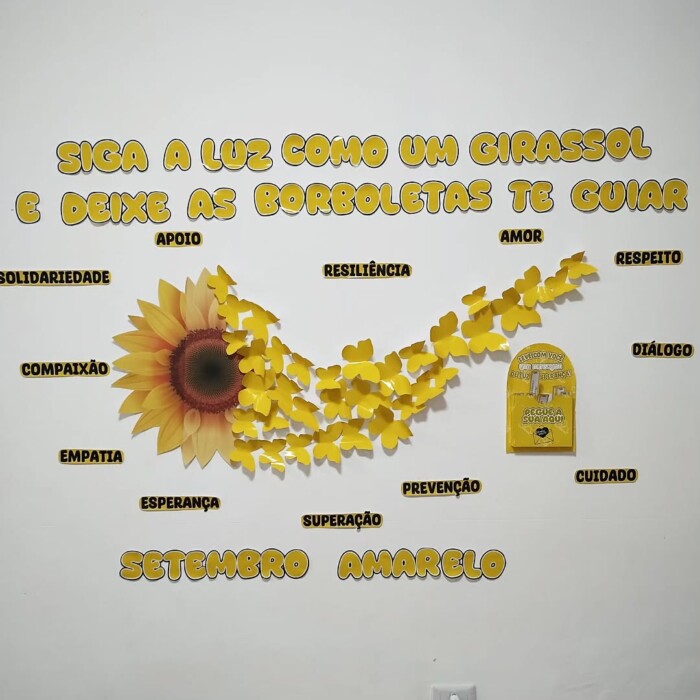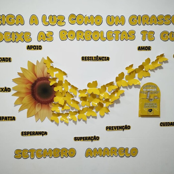 ✔ Painel decorativo “Siga a luz como um girassol e deixe as borboletas te guiar” – com palavras-chave sobre empatia, superação, amor e cuidado.