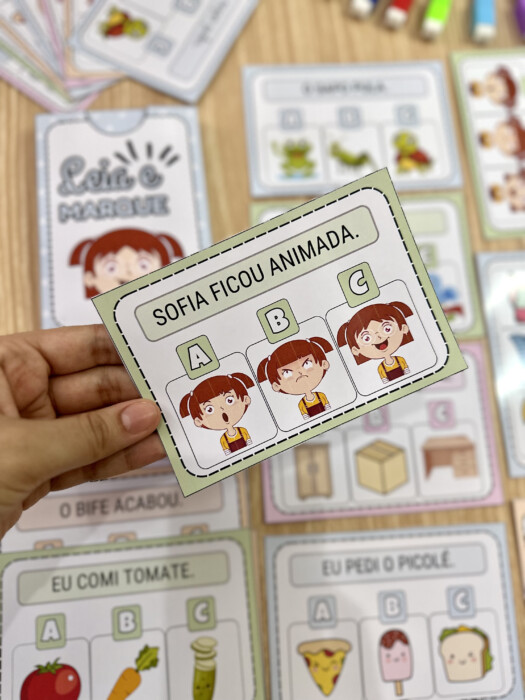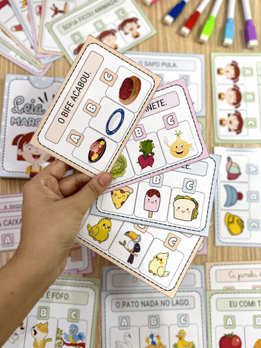 A proposta é que a criança leia a frase e identifique qual imagem corresponde àquilo que leu, realizando a marcação correta. As frases são elaboradas com sílabas simples, linguagem acessível e estrutura previsível, facilitando o engajamento de leitores iniciantes.