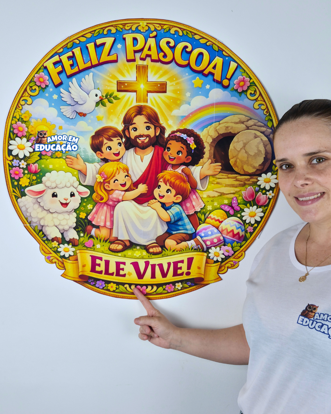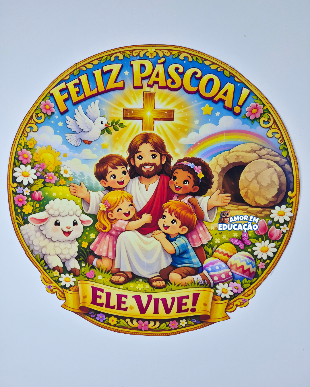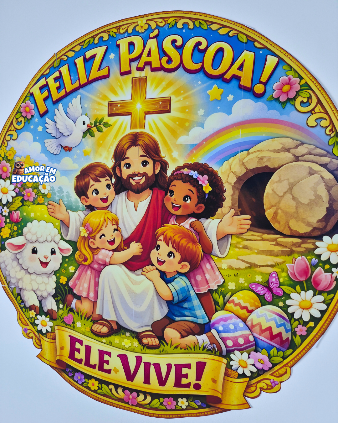 Com ilustração infantil encantadora, o painel traz uma composição cheia de vida, fé e beleza para celebrar a ressurreição de Jesus.