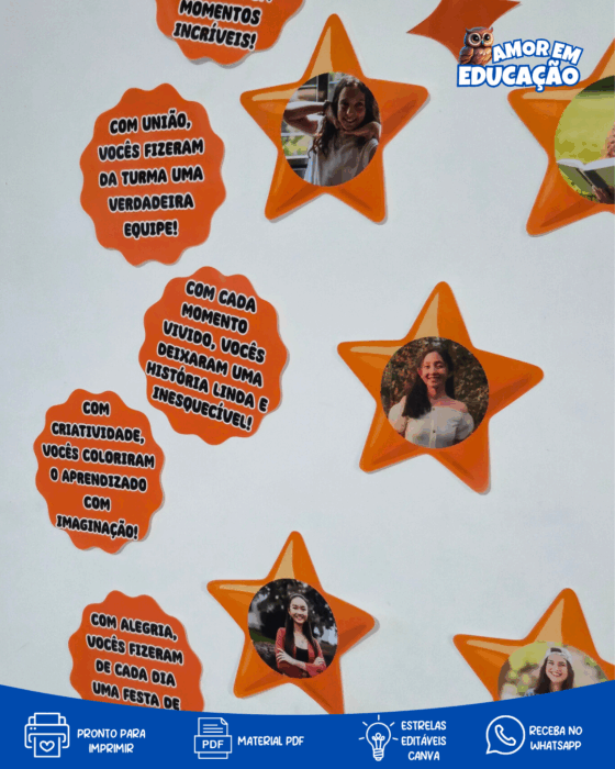 🧩 As estrelas são editáveis no Canva, para você personalizar com as fotos dos seus alunos e montar sua constelação brilhante!