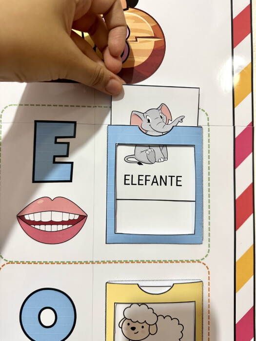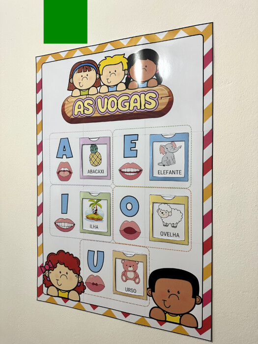 Painel ampliado (73cm de altura x 50cm de largura) com boquinhas fonoarticulatórias e envelopes das vogais.