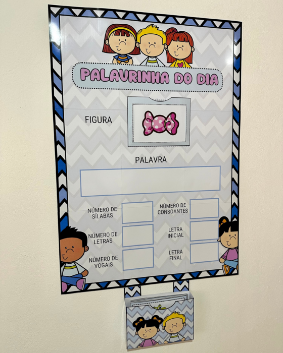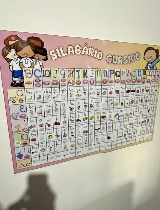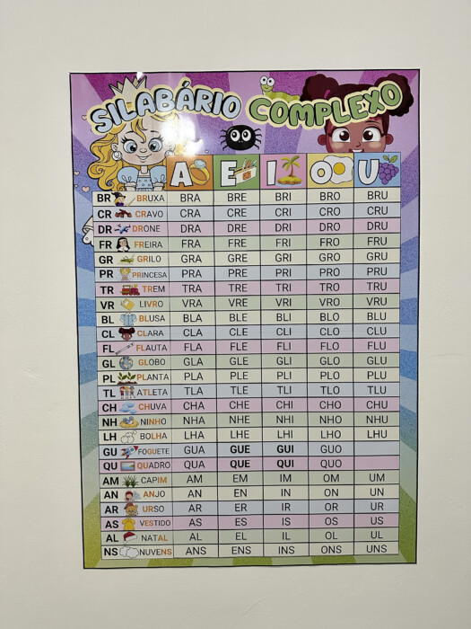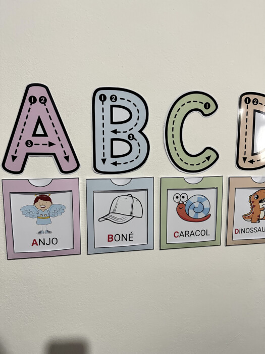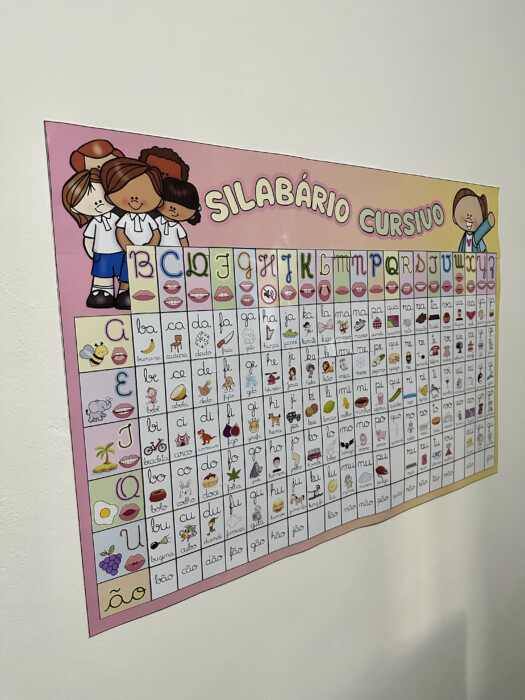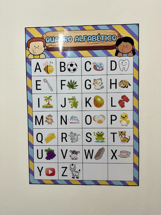 Painel com letras e imagens para apoio no processo de leitura e escrita.