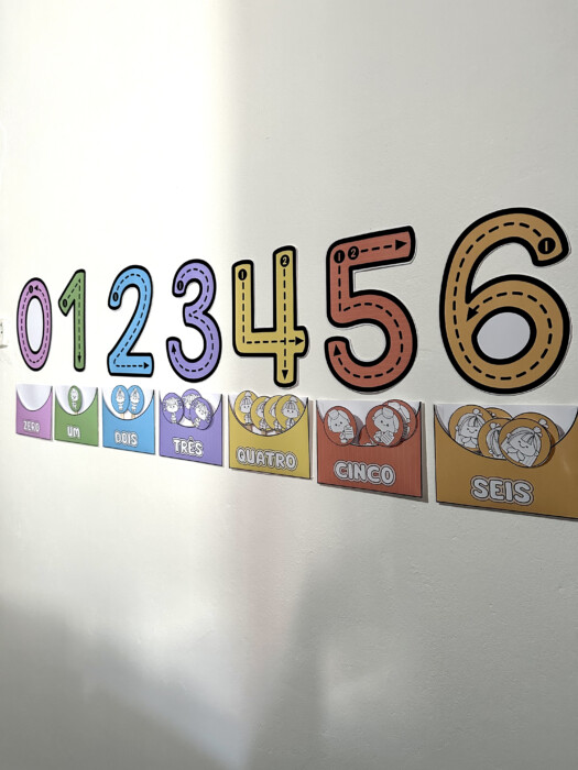 Painel interativo com envelopes e elementos para trabalhar as quantidades.